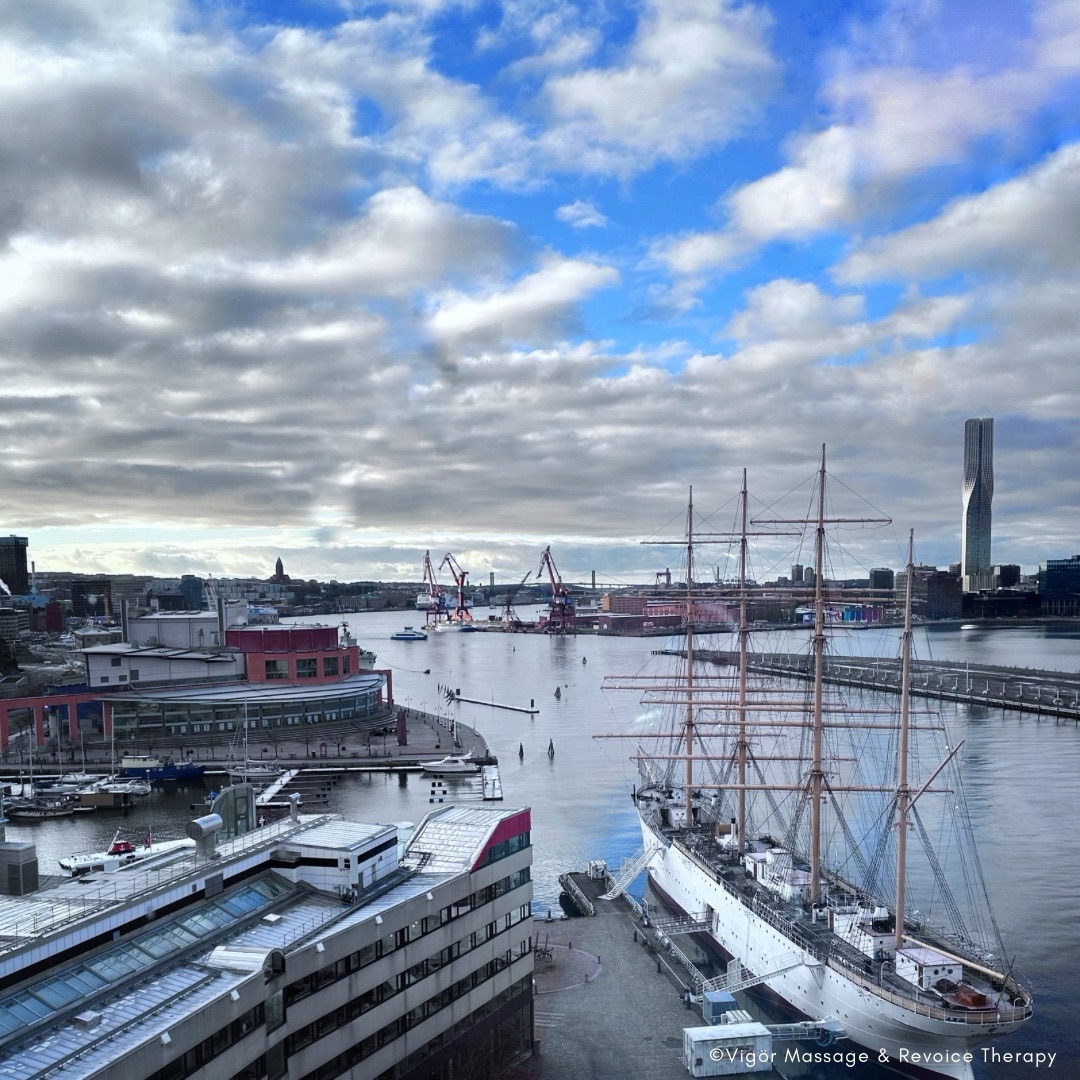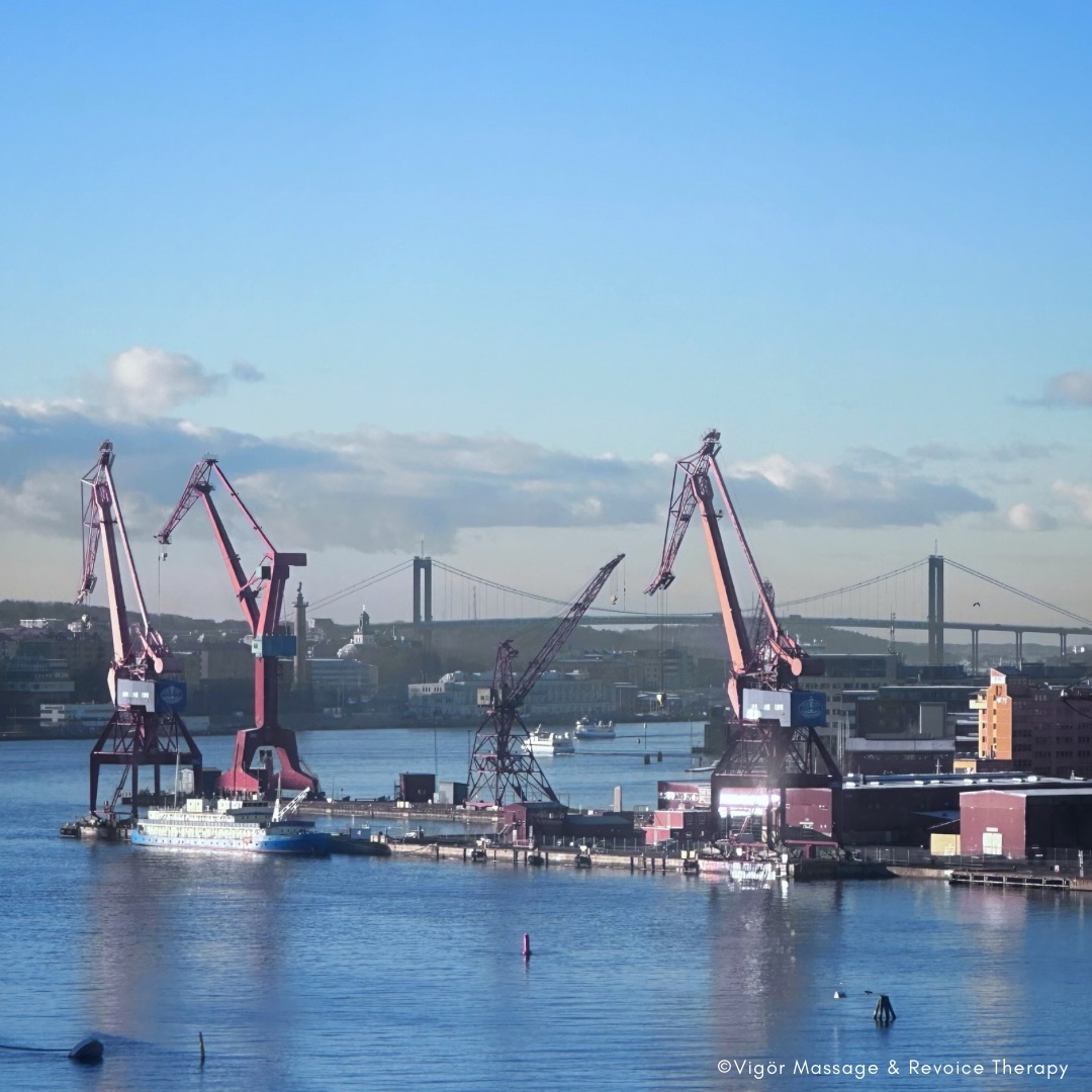 The Älvsborg Bridge & Cranes — Gothenburg shows its best side from the treatment room.