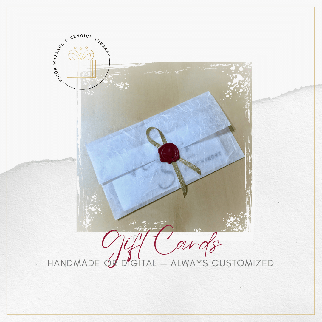 I offer custom made digital gift cards. You forward it via SMS, Messenger, email or similar and the recipient plays it as a short video clip on their device. The gift cards can also be printed if you wish to do so.